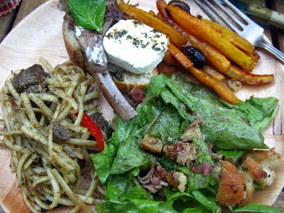 It was an awesome week of carrots and delicious food. We had a planned yet spontaneous dinner club this week. There was a feast of: lamb shanks on baguette with goat cheese, (more) lamb with linguine and pesto, roasted home grown carrots with lemon and kalamata olives, a salad with lettuce from the garden, fried speck, walnuts and croutons, and anchoiade and baguette. I didn't get a picture of the dessert but it was fab-o. Sean made an apricot custard that was really tasty. We ate outside because the weather was great and ended the night around the fire. Thanks friends for a fantastic evening!
